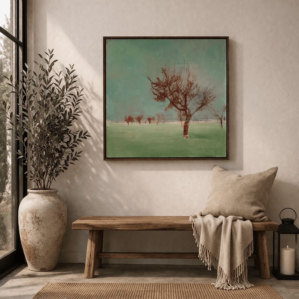 Original oil painting featuring rich holly berries rising from a cracked celadon-style vessel. Finished with Treasure Gold wax gilt, bronze accents, and subtle leaf detailing for a warm, luminous edge. The piece is framed and ready to hang.